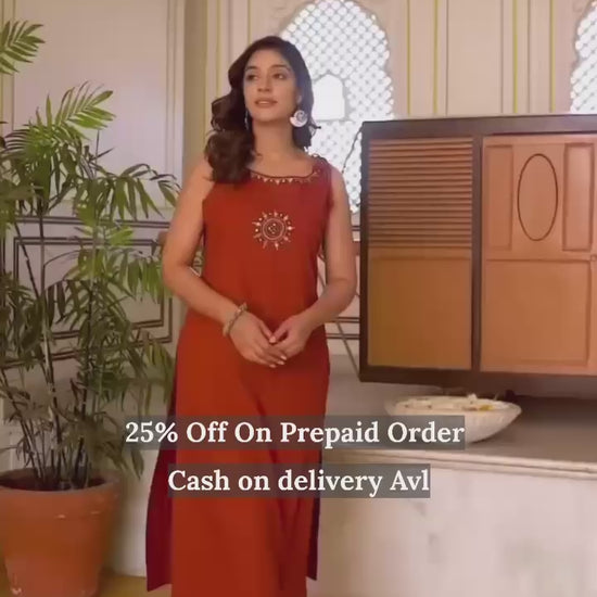 Turn heads in this stunning rust-colored kurta set, perfect for festive elegance or everyday royalty.