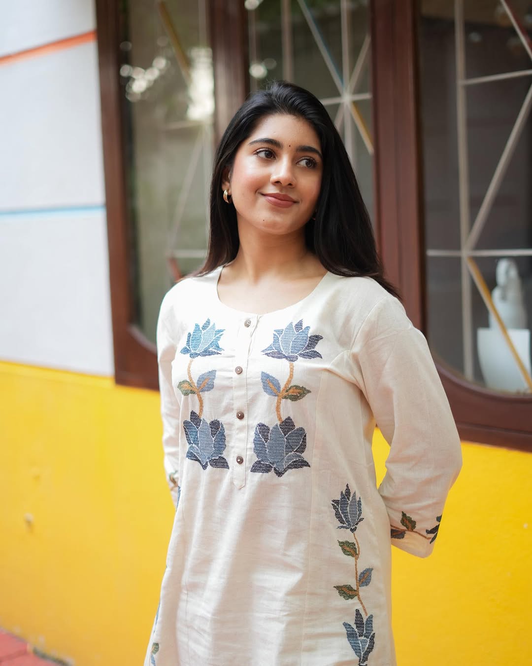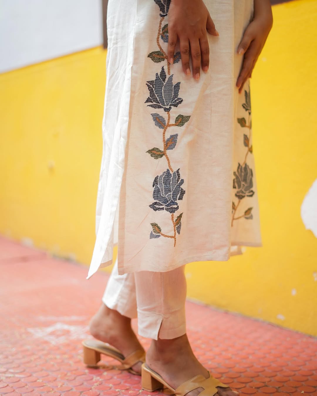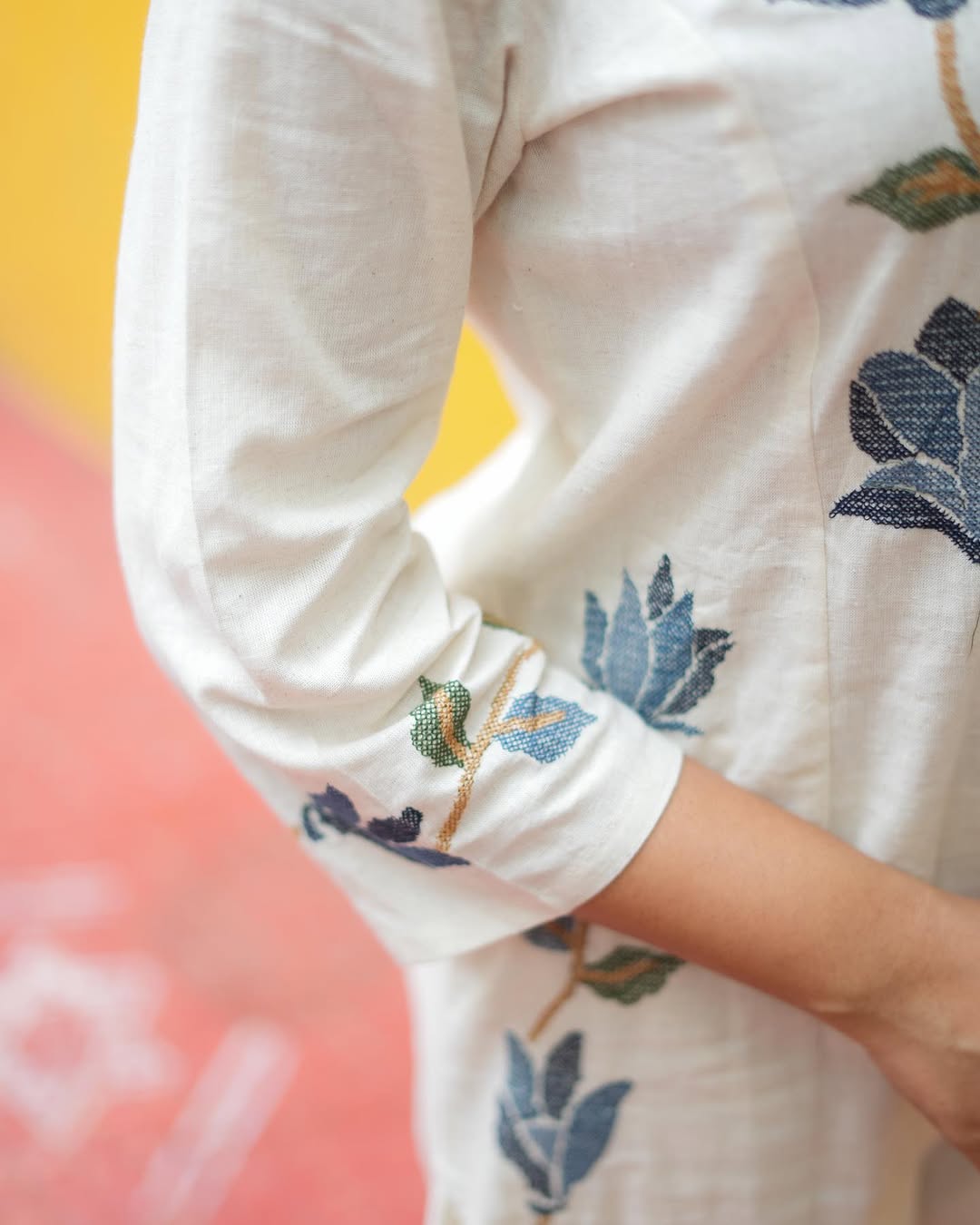 beautiful handloom cotton kurti with round neck embroidery detailing in neck elbow sleeve and